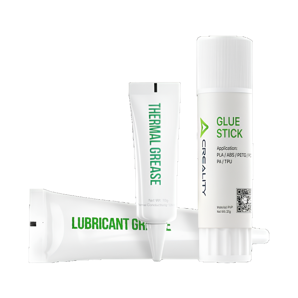 Kit de acessórios para impressora 3D da Creality com cola bastão para mesa de impressão, pasta térmica e lubrificante. Ideal para melhorar a adesão das peças, auxiliar na dissipação térmica e contribuir para o bom funcionamento da impressora.