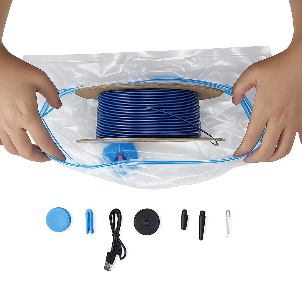 O kit combina vedação eficiente e materiais selecionados para garantir um armazenamento seguro e estável do filamento.