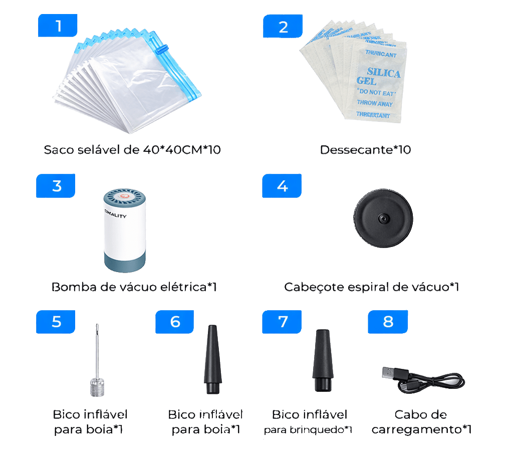 O kit reúne recursos pensados para facilitar o armazenamento do filamento, com sucção eficiente, operação prática e detalhes que ajudam no uso recorrente.