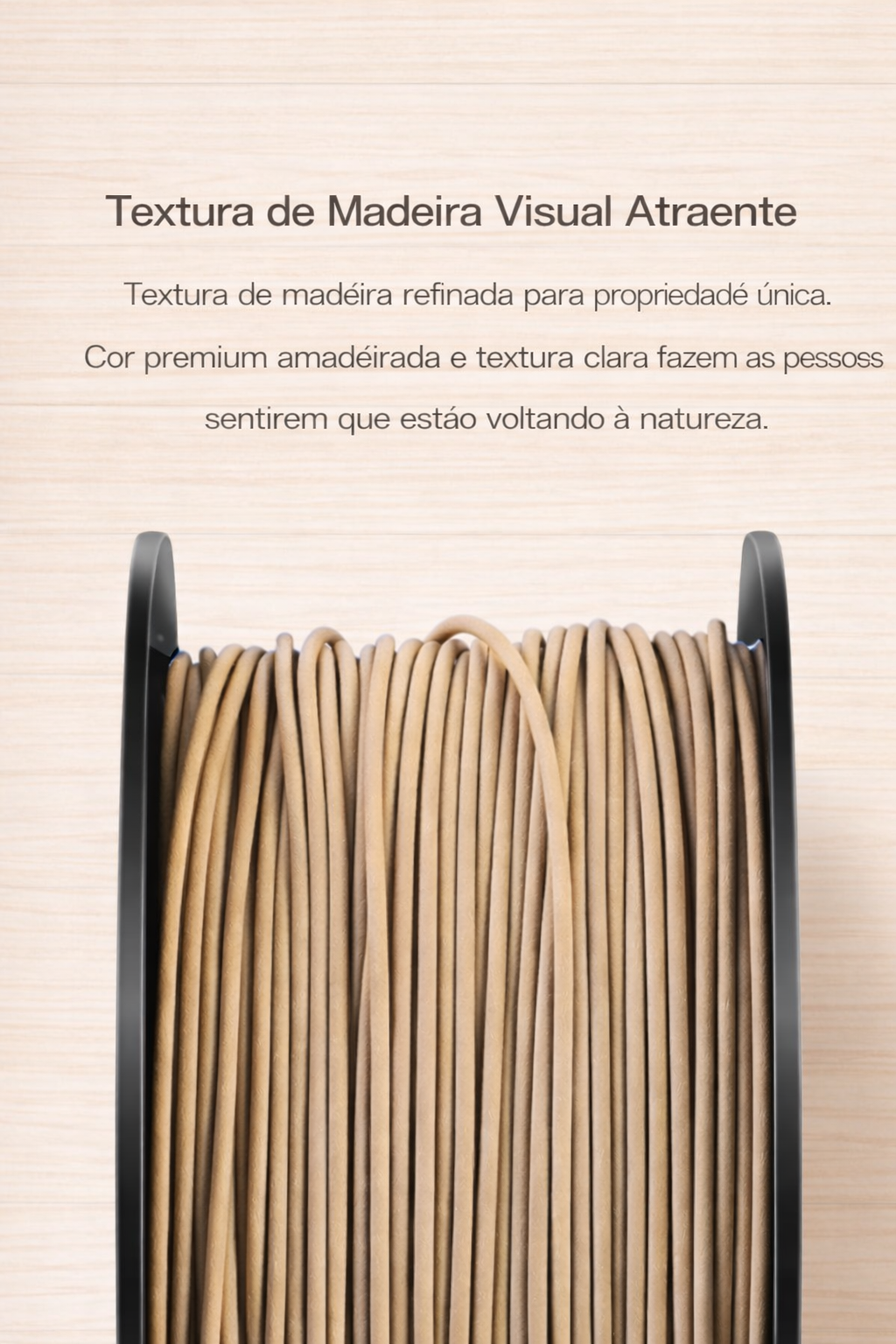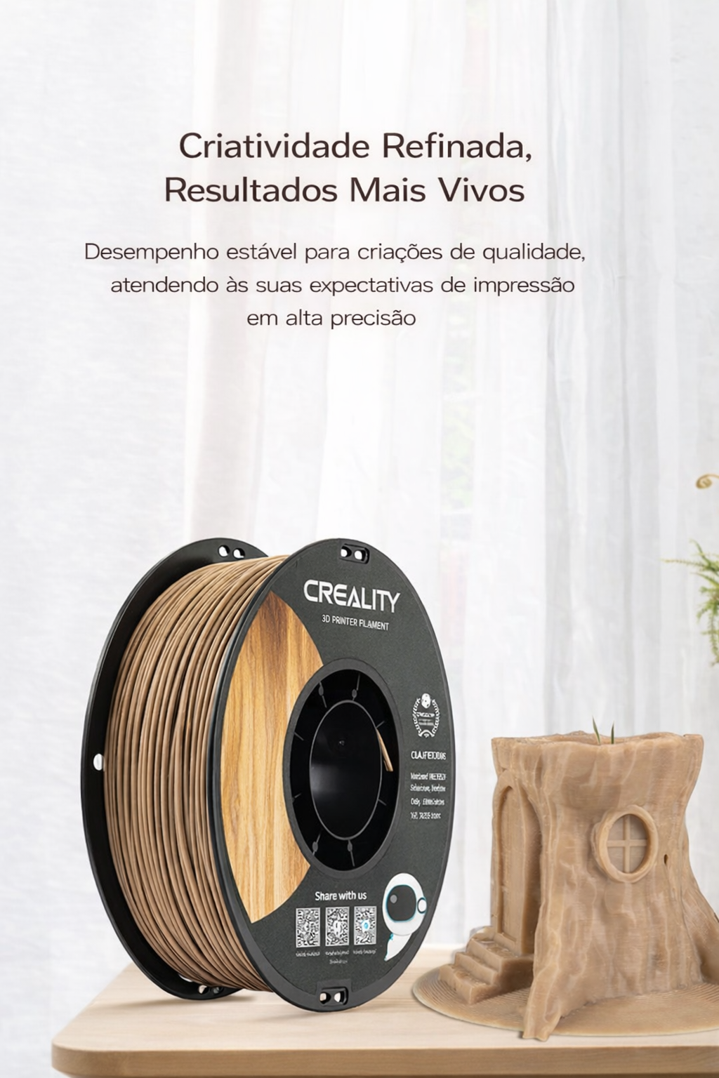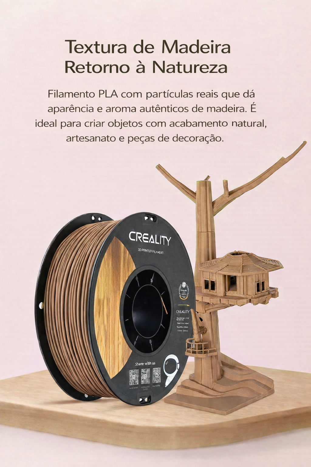 Filamento CR-PLA Wood Creality desenvolvido para impressões 3D com aparência e textura semelhantes à madeira, proporcionando um acabamento visual natural e diferenciado.
