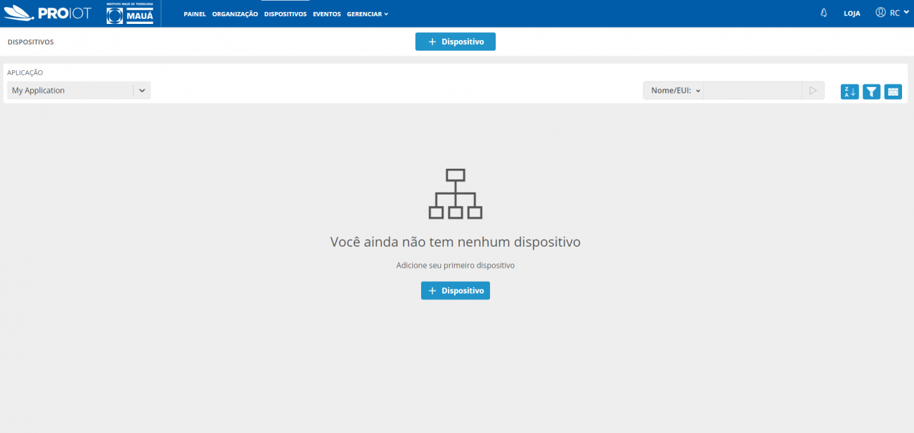 Assim que a "Organização" e a "Aplicação" estiverem corretamente criadas e configuradas, acesse a seção "Dispositivos" da plataforma para iniciarmos a configuração. Ao acessar essa seção, clique sobre o botão "+ Dispositivo" da página, como na imagem abaixo.
