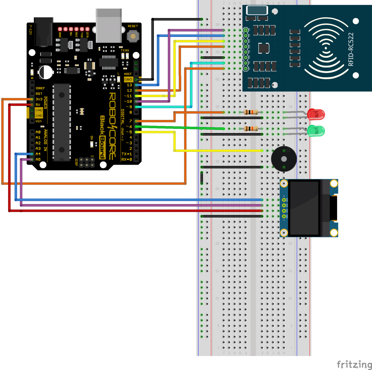Já que aprendemos a ler as identificações das tags, que tal criarmos um controle de acesso para liberar uma porta ou até mesmo um cofre? Neste projeto, o acesso liberado será simulado por LEDs e um Buzzer, porém você pode adaptar o projeto para fechaduras eletrônicas, por exemplo.
