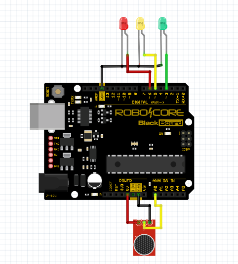 Utilizando um sensor de som (microfone) e um Arduino, o projeto classifica o ruído em três níveis: pouco, médio e alto, representados respectivamente pelos LEDs verde, amarelo e vermelho.
