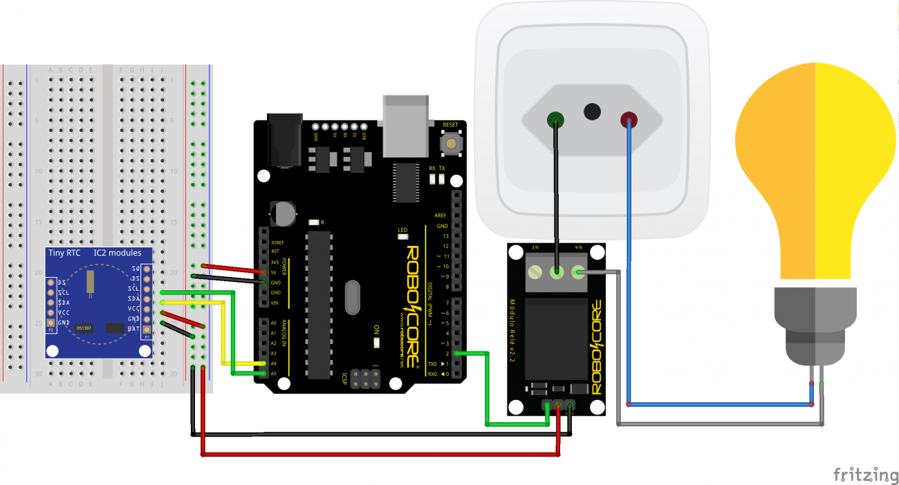 Agora que já sabemos como funciona um RTC, iremos, a partir dele, acionar um relé em um horário predeterminado. Por exemplo, na sua cidade escurece às 18h. Que tal fazer com que todos os dias, nesse mesmo horário, o relé que liga uma lâmpada na sua garagem acione e permaneça ligado até o amanhecer?