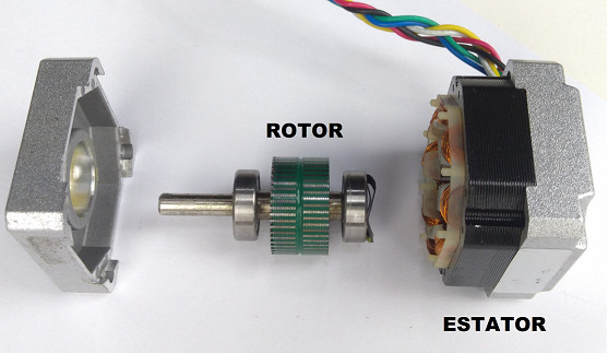 A imagem abaixo mostra todas as peças de um motor de passo hibrido. Veja que o motor é composto basicamente por um rotor (peça central) e um estator (peça à direita).